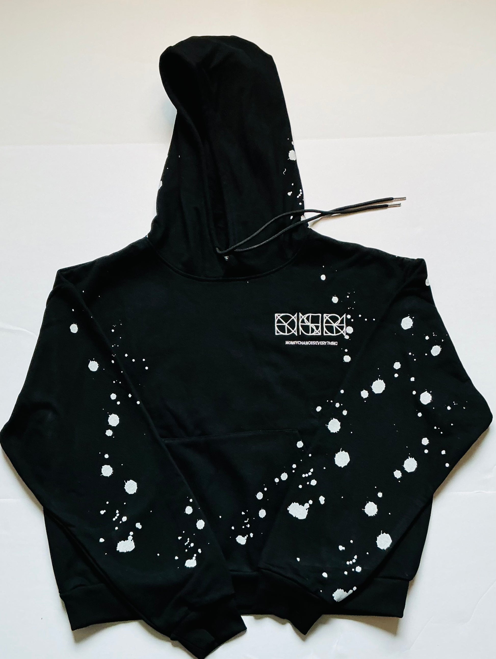 This is a black hoodie featuring a bold, graffiti-style design with white and red outlined bubble letters that spell out “ENVY.” Each letter contains smaller text that collectively spells out “MONEY CHANGES EVERYTHING.” The hoodie is also decorated with white paint splatter details for an edgy, streetwear vibe.